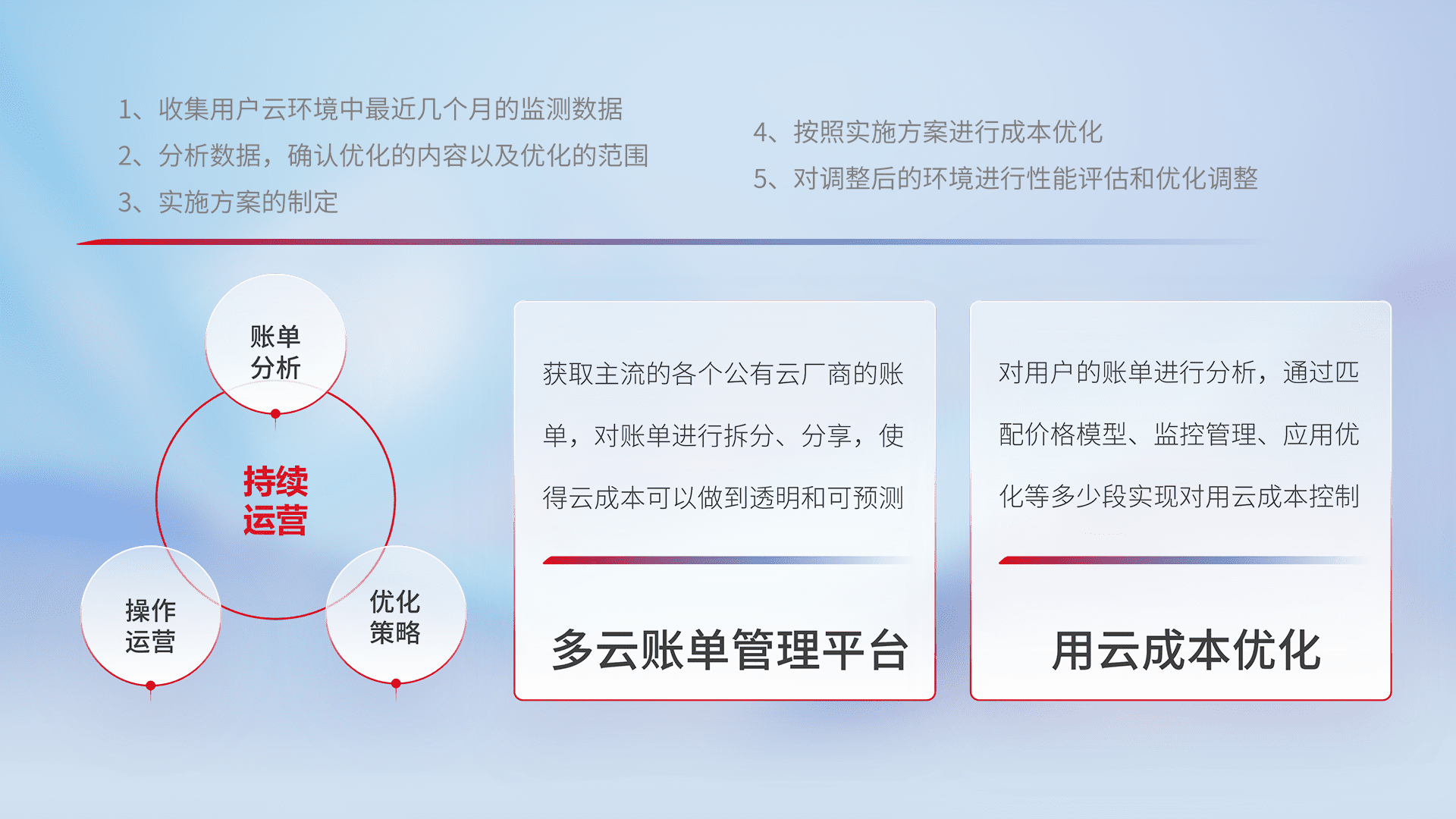 通过灵活运用多种自动化迁移工具,,,,帮助企业用户实现业务和数据高效 、、、稳定的上云迁移和云上迁移,,采用自研多云纳管平台,,以中立管理模式,,,解决多组织、、、多云、、、、多运维厂商的复杂关系的管理,,保证多云平台资源配置的一致性,,,实时掌控云资源运行数据,,,运用智能化工具分析云资源多云平台的管理服务,,,,透明化管理成本支出,,,,用云成本可预测、、、用云费用可优化、、云资源配额有据可依。。。