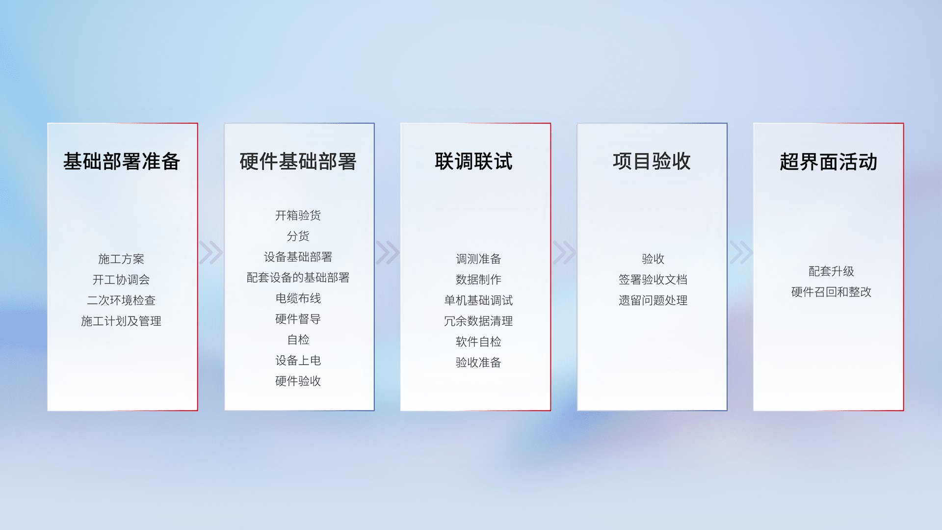 从基础部署准备、、、、硬件基础部署、、联调联试、、、项目验收、、、越界面活动的全过程可追溯,,,,保证施工质量和进度。。。。